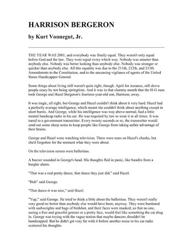 Harrison Bergeron is a satirical story that critiques the idea of absolute equality. Vonnegut uses humor and exaggeration to show how absurd it is to try to make everyone the same. The story is a warning against the dangers of totalitarianism and the importance of individuality.